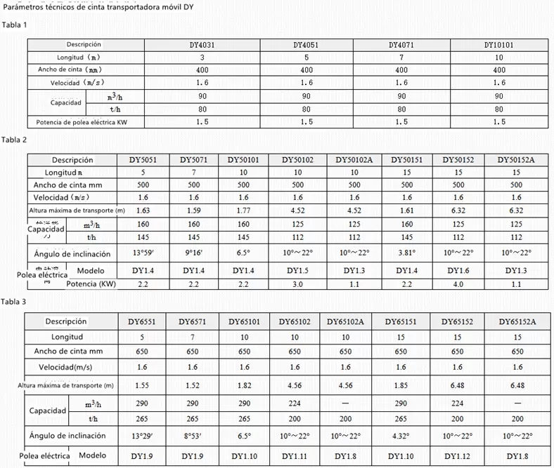 La característica principal de la cinta transportadora móvil tipo DY es el uso de polea de superficie duro de alta precisión y su capacidad de carga (2-3 veces mayor que la de las poleas de superficie blando); larga vida útil (hasta 10 a?os); estructura compacta, huella peque?a (se puede reducir en más del 50%); peso ligero y tama?o peque?o (puede reducirse en un 50%); especialmente la estructura de transmisión vertical es más adecuada para su uso en maquinaria de transporte de minas subterráneas.